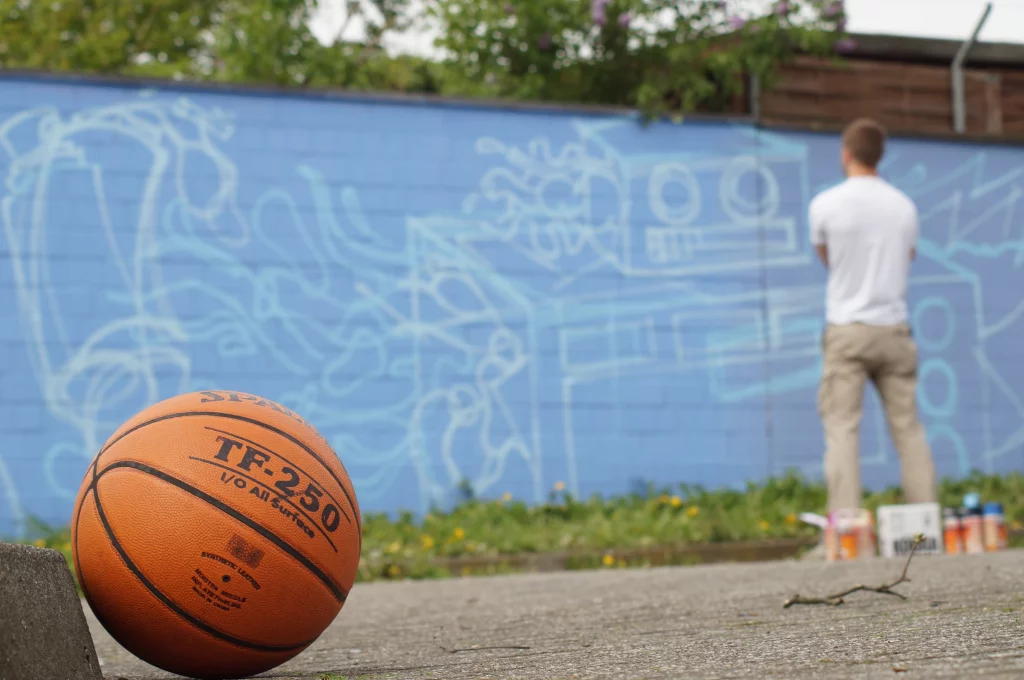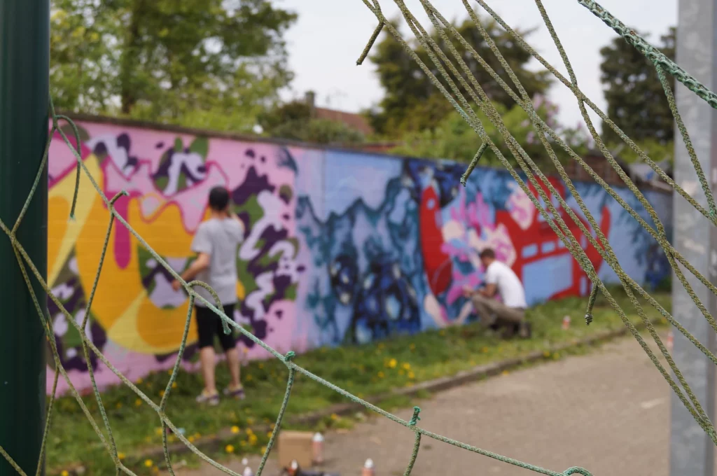 Unsere Nachwuchs-Künstler*innen, die dem Verbunt jahrelang treue Projektteilnehmer*innen waren, organisieren und kuratieren die Veranstaltung, bei der junge Graffitimaler*innen aus Düsseldorf an einem Wochenende zu pumpenden Bässen frische Farbe auf die Wände bringen, zusammen grillen und kickern oder Billard spielen.
