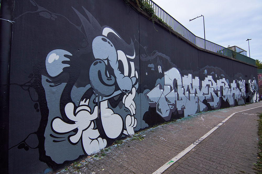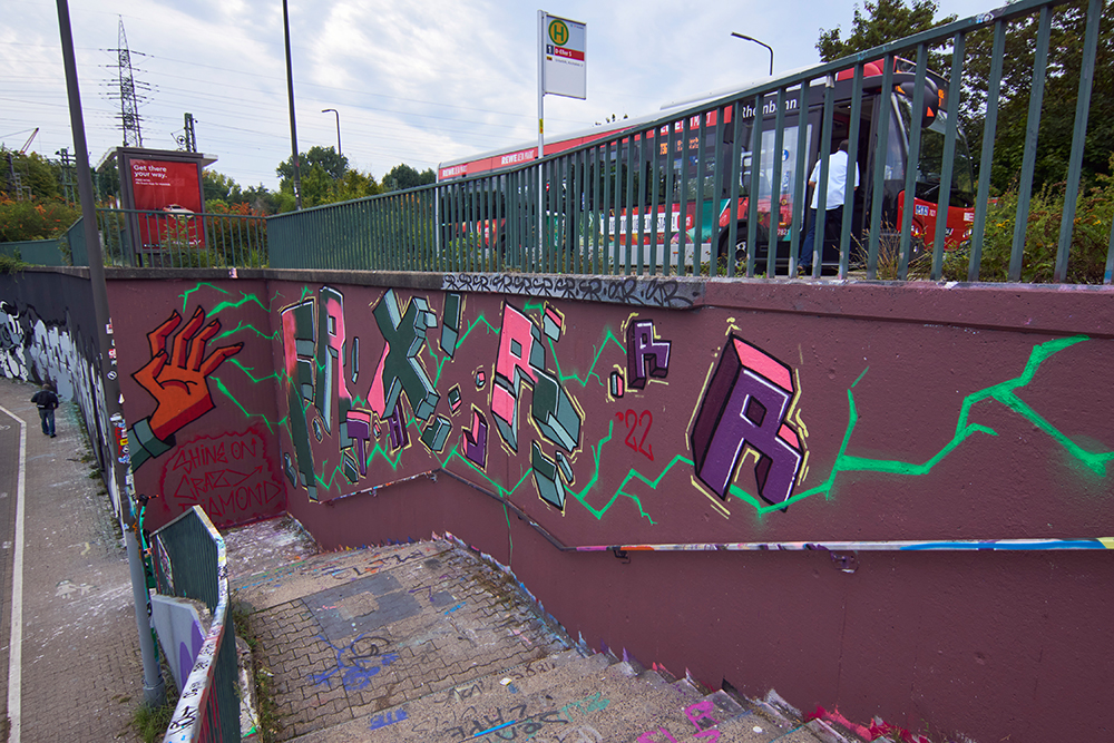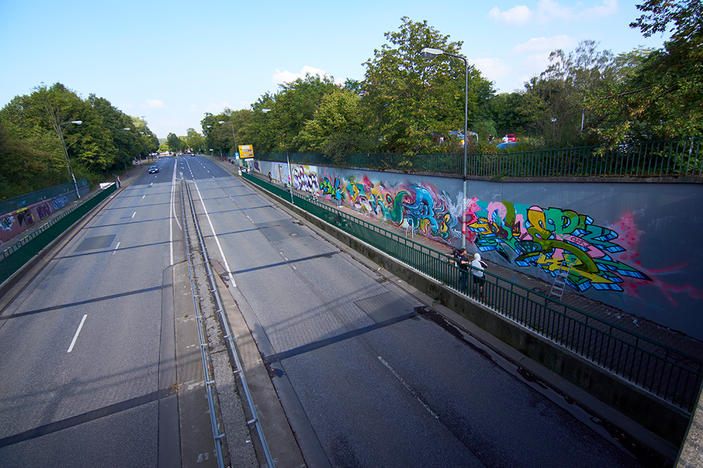 Die erste und größte Freifläche in Düsseldorf. Auf den Wänden der Unterführung an der Vennhauser Allee unterhalb des S-Bahnhof Eller, findet man alle Formate für Anfänger und Fortgeschrittene (max. Höhe 6m).